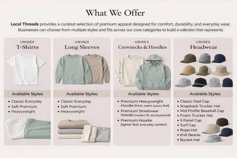 Local Threads makes it easy for businesses to launch their own apparel line without the hassle. We handle production and fulfillment so you can focus on running your business. Simply upload your logo or designs and use our easy customization tool to create your collection.